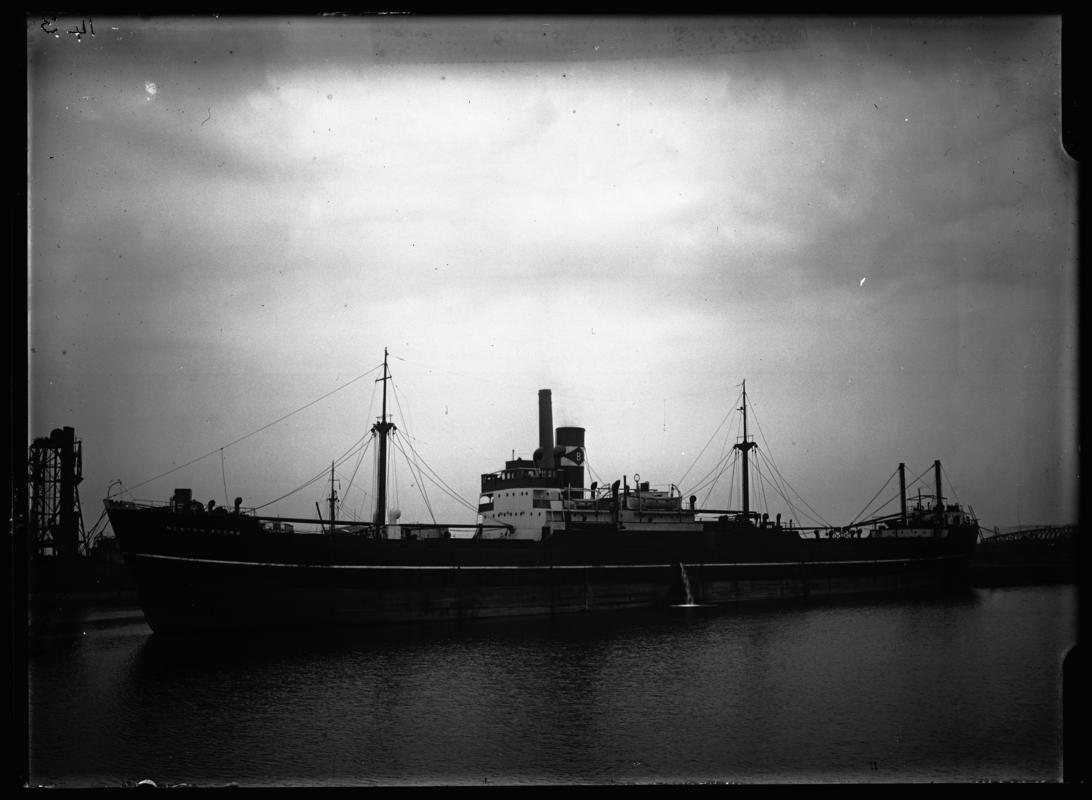 ¾ Starboard stern view of H.M.S. DUCHESS approaching Cardiff Docks. Tug also in image.