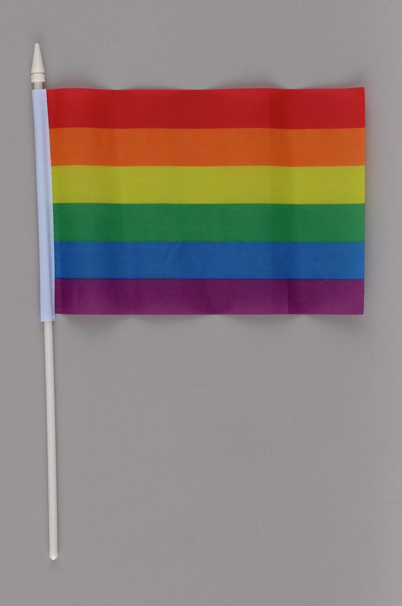Hand held Rhwydwaith LHDT+ Heddlu / LGBTQ+ Police Network transgender flag on white card stick. Given out during the parade at Swansea Pride, Saturday 30 April 2022. Collected to show the range of free promotional and advocacy material available at Pride events.