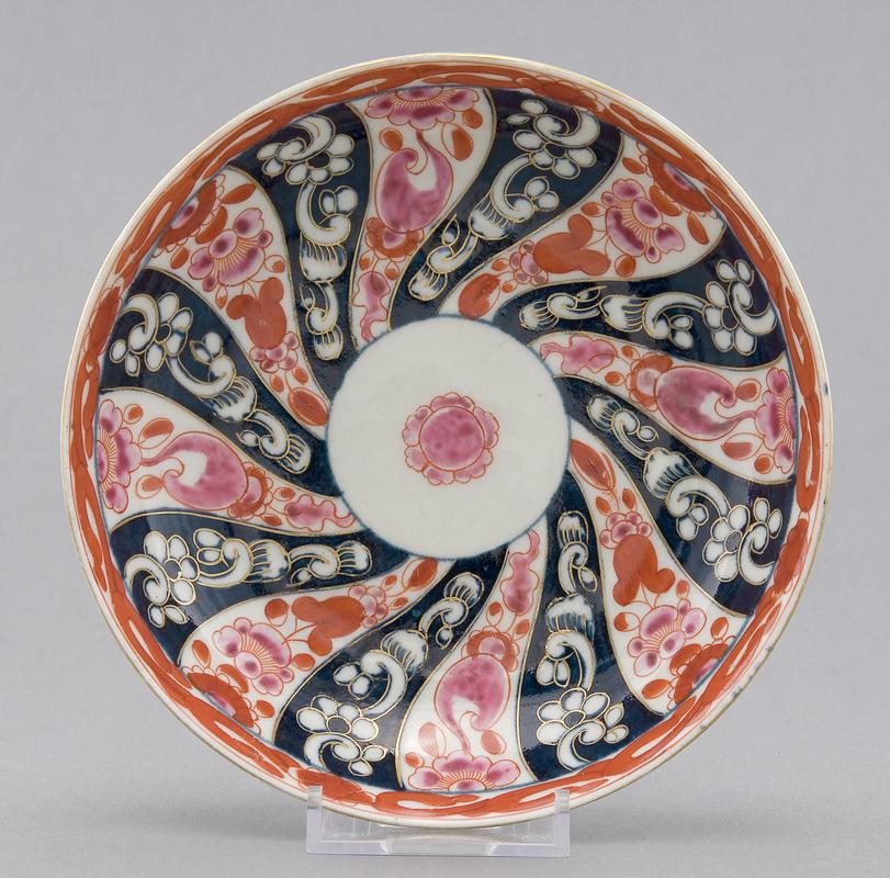 Saucer, soft-paste porcelain, footring; decorated with the 'the three flowers' pattern in underglaze blue, the rim is banded with two thin lines in underglaze blue.