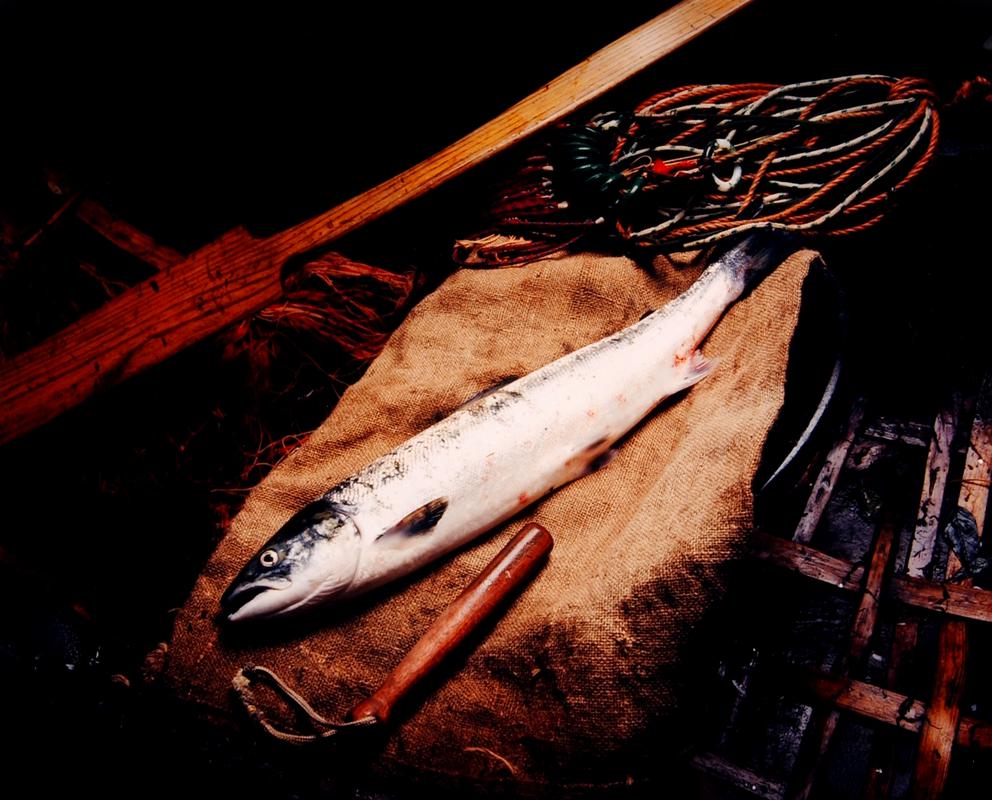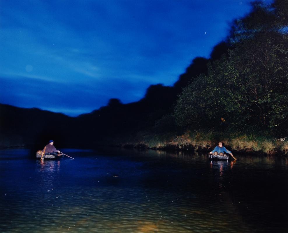 Gerwyn Davies & Len Walters hauling in net whilst coracling on the Teifi, summer 2003.