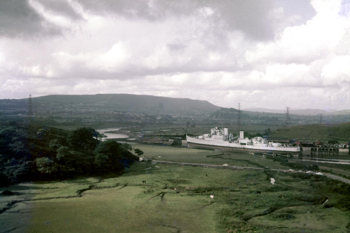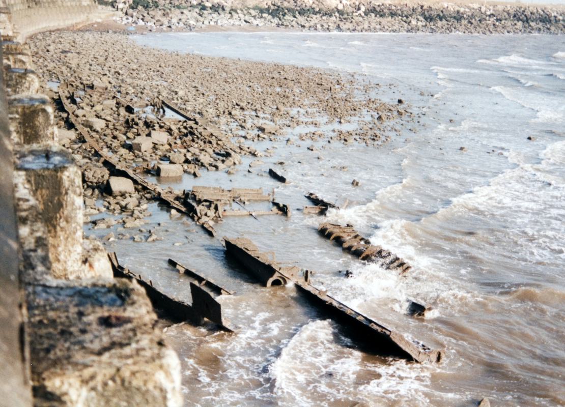 Remains of floating iron lock gate at Briton Ferry Dock, 1985. The photograph is looking north from the south side of the entrance into the partly infilled inner dock. The southern approach viaduct of the A48 Neath River Crossing is visible in the background. The dock including its single floating gate was built to the design of Isambard Kingdom Brunel.