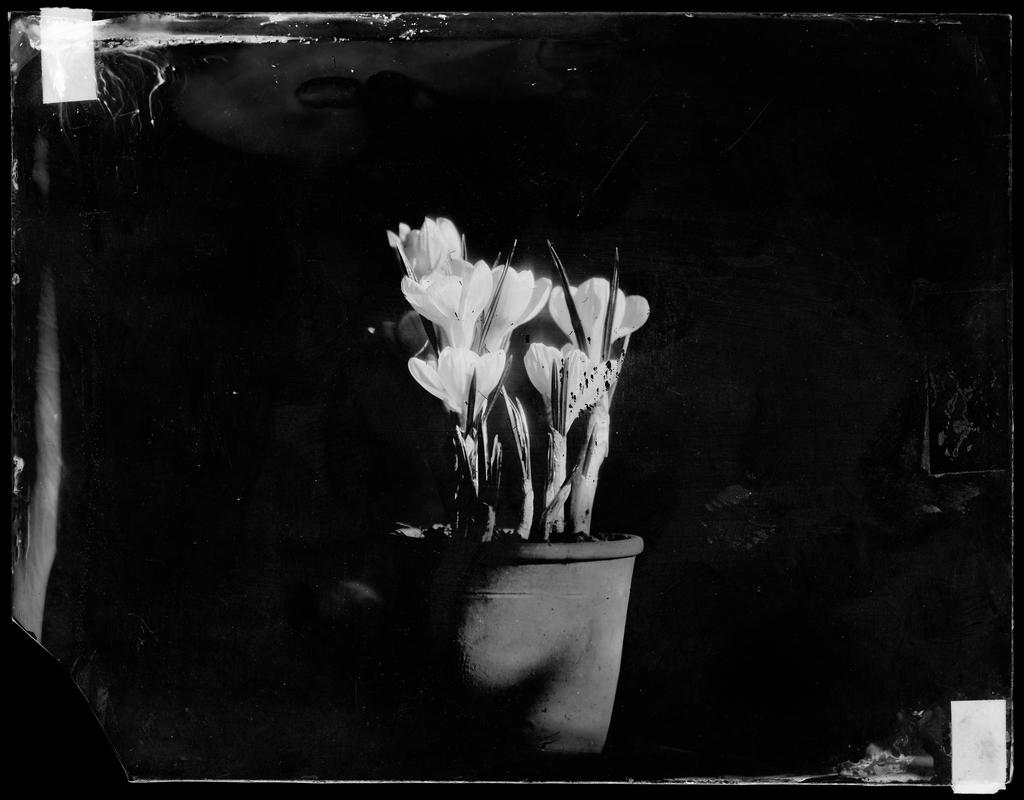 Collodion glass negative showing a vase of crocuses.