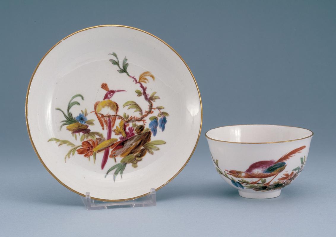 Tea cup and saucer, cup hemispherical, standingon a foot rim, flared sides, everted lip, floriate C-scroll handle; painted in polychrome enamels, opposite the handle with an exotic bird in brown, yellow, red and puce, standing on a pile of stones, a branch with red blooms issuing to right, and another with blue flowers to left, gilt border line to lip, gilding to handle, green ermine tail painted inside. Saucer, standing on a foot rim, spreading sides, everted lip; painted in the centre with a bird in a similar palette, perched on a pile of stones, amid foliage and flowers, a branch behind with green and purple foliage and yellow fruit, gilt border line to lip.