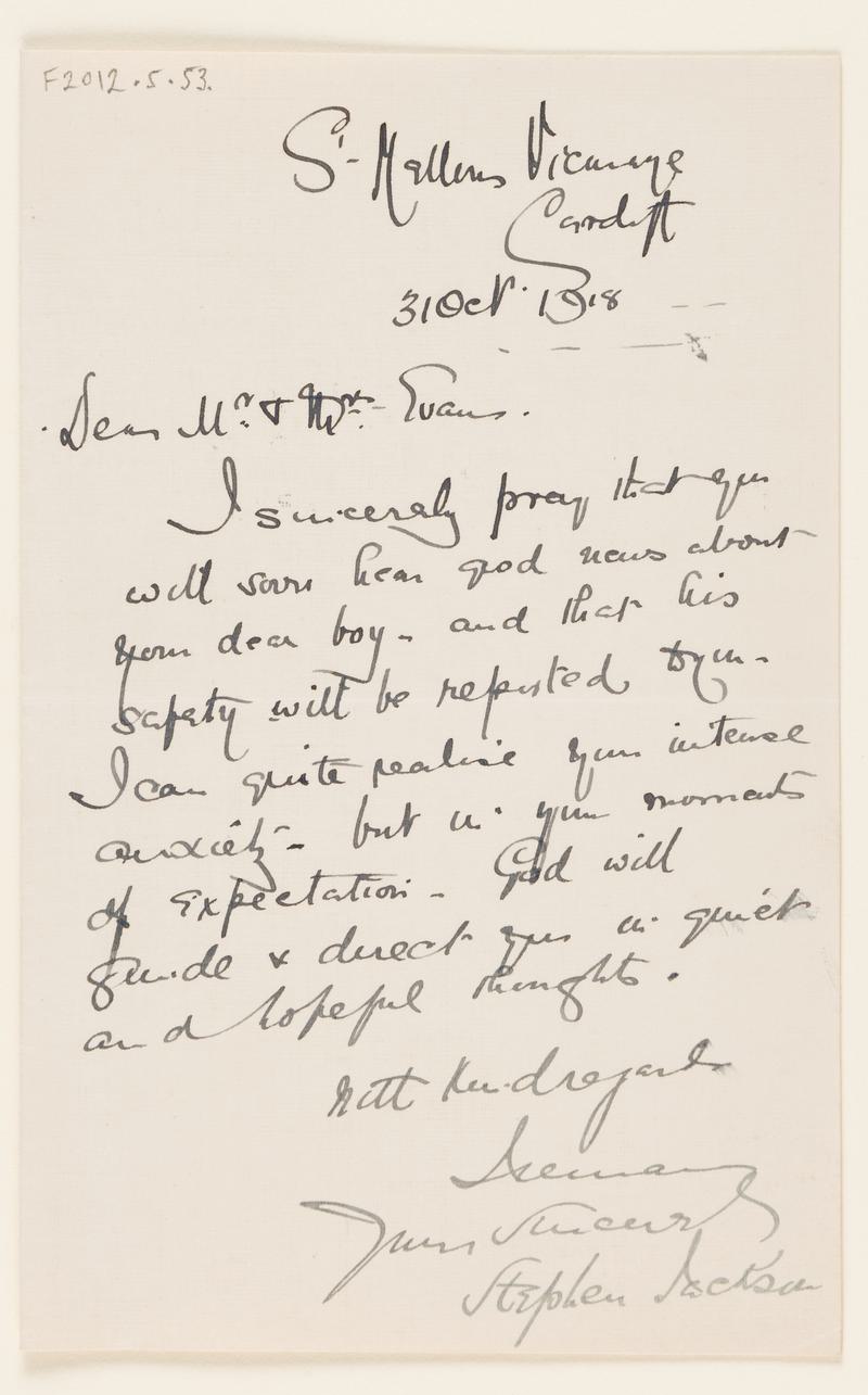 Framed fragment of a FE2B aeroplane named CHEERIO, cap badge, and medals awarded to Lieutenant John Henry Matthews of the Royal Flying Corps. John Henry Matthews was born in Canton, Cardiff, in 1891. His love of planes led him to join the Royal Flying Corps as a squadron pilot. He was awarded the Distinguished Flying Medal in 1917.