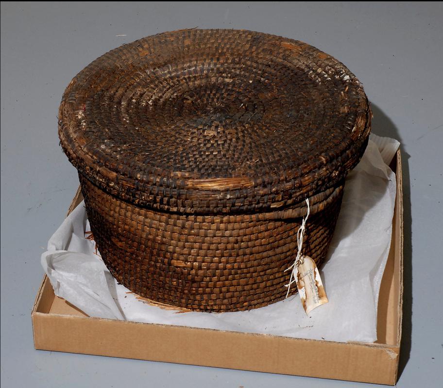 circular woven cane basket, solid wooden base, painted dark pink