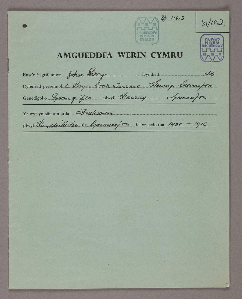A Welsh Folk Museum Answer Book, 1967, containing relevant notes on the history of hearses in the upper part of Llanddeiniolen between the years's of 1902-1904. Answer Books were sent out by the Welsh Folk Museum to individuals across Wales as a way of collecting and documenting information on aspects of folk culture in their areas, including agriculture, crafts, food, customs and dialects. The responses were hand-written in the books. The Answer Books had a similar purpose to the earlier questionnaires sent out in 1937.