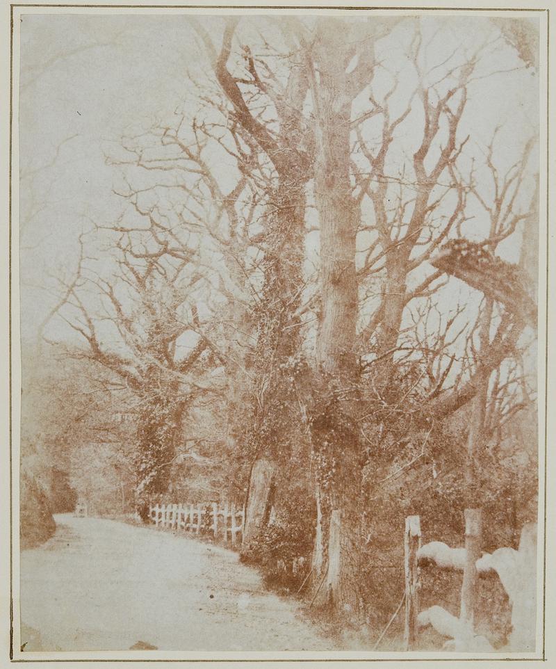 Mounted salted paper print. Drive at Penllegaer. Photograph outlined in black ink on mount.