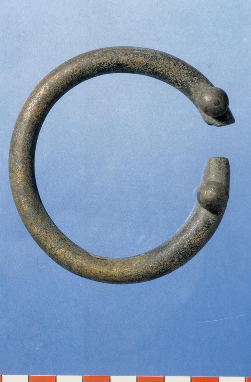 Penannular, copper alloy tubular rein-ring, too distorted to reconstruct the original dimensions but curvilinear in shape and circular in cross-section (diameter 8mm) with a butt-join on the inner-face. Each end of the rein-ring is pierced by two pairs of diametrically opposed rivet holes (diameter c.2mm) set on the upper and lower sides. The inner pairs on both sides show considerable wear facets around their circumference, caused by lost stop-studs, giving the ring a pinched appearance. Wear facets are also observable on the inner-face at each end of the ring.