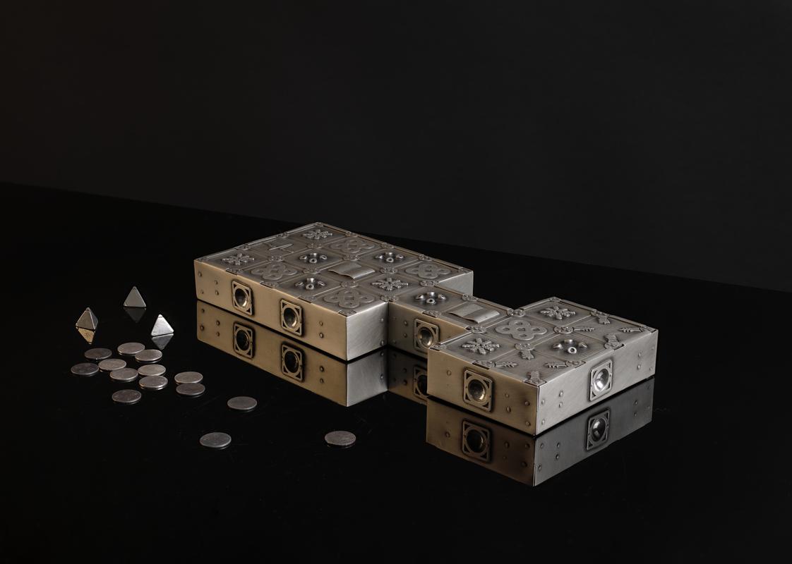 <p>Gameboard, rectangular shape based on Royal Game of Ur. </p> <p>The original object was excavated from the Royal Cemetery in Ur in Iraq in c.1928 by Sir Leonard Woolley and is now held in the British Museum – Registration number 1928,1009.37. It was produced around 2600BC-2400BC. While there are interpretations there is still no clear way to play the game.</p> <p>In 2025 silversmith Will Romeril recreated the gameboard with 20 squares containing designs and information relating to facts and statistics found in government reports, service provider and economic data websites. Reflecting that the infrastructure of modern Britain is a game we don’t know how to play. Suitably titled: Royal Game of Urm...?</p> <p>Both the artefact in the British Museum and this artwork contains 18 pieces - 1 gameboard, 3 tetrahedral dice, and 14 player tokens.</p>