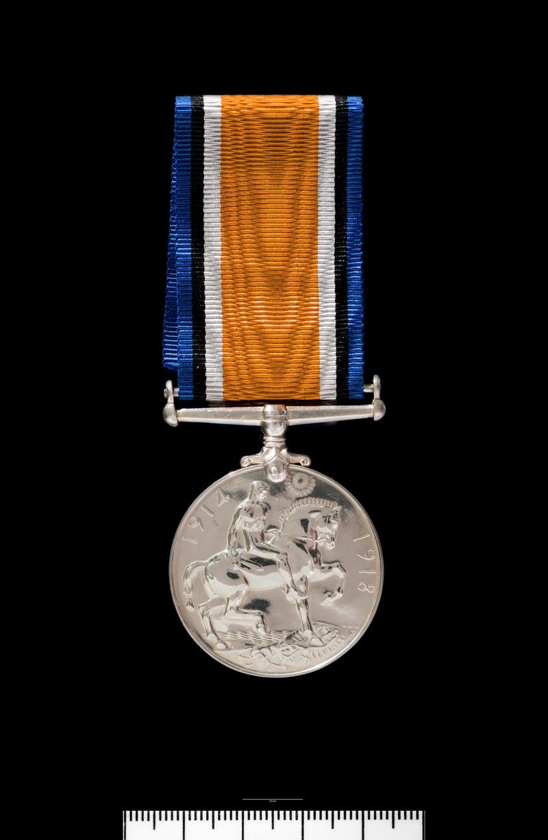 British War Medal 1914-1918. The medal hangs from its silk ribbon (central vertical stripe of gold with stripes of white and black at each side and borders of royal blue) by a straight suspender bar without swivel. The obverse bears the coinage effigy of His Majesty the King with the legend GEORGIVS V:BRITT: OMN:REX ET IND:IMP:. The reverse depicts a male figure mounted on horseback, trampling underfoot the eagle shield of the Central Powers and the emblems of death, a skull and cross-bones. Above is the risen sun of victory. Mounted on a bar.