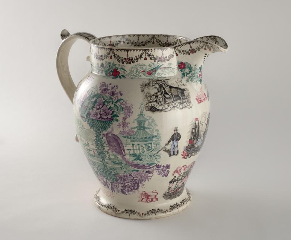 Cup, earthenware, standing on a rounded spreading slightly waisted foot-rim, the lower body concave, the upper body with flaring sides, ogee handle; transfer-printed in black with to the exterior sides of the body two different rural scenes, one showing three figures standing on a promenade and gazing out over an expanse of water, a multi-towered building, trees and mountains in the background, the other showing three figures in front of a swiss-style chalet with alpine trees in the background, a small scene of a building and trees to the interior bottom of the bowl, a black band around the interior sides of the body and a black band to the interior lip-rim, a black dash to the handle.