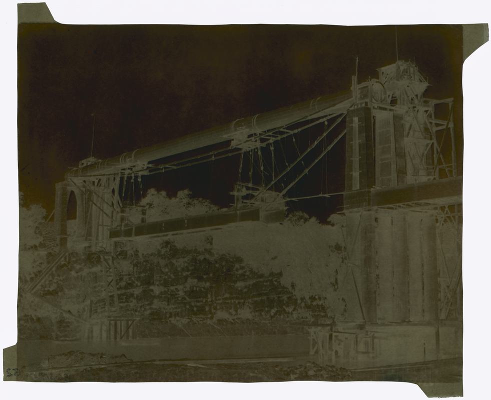 Salted paper print. A view of the River Wye showing Chepstow rail bridge under construction. Rivers and sailing ships in foreground.