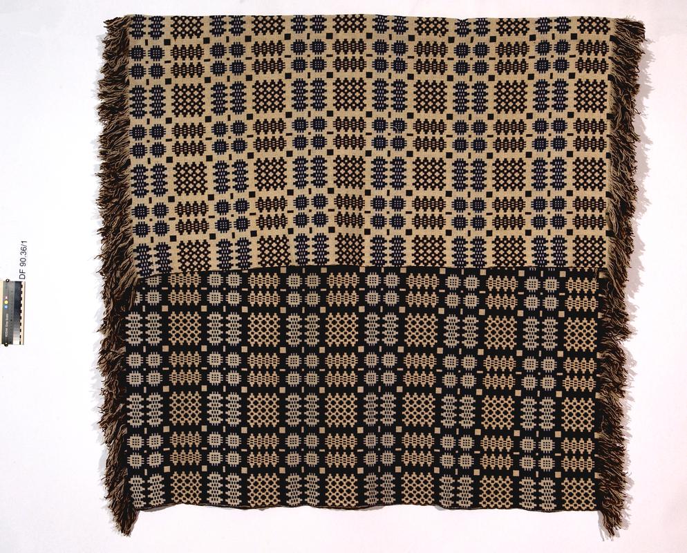 Brown, yellow and white geometric design on light blue base. Woven at Elvet Mills, Cynwil Elfed.