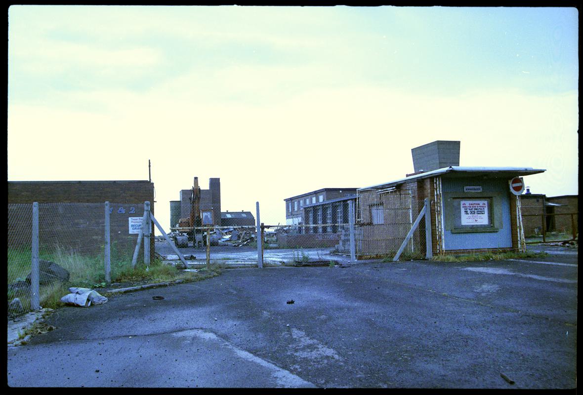 Black and white film negative showing the afternoon shift waiting for their ride at the entrance of the mine, Cwmgwili Colliery.