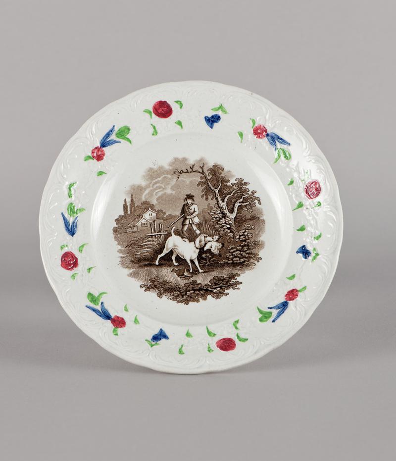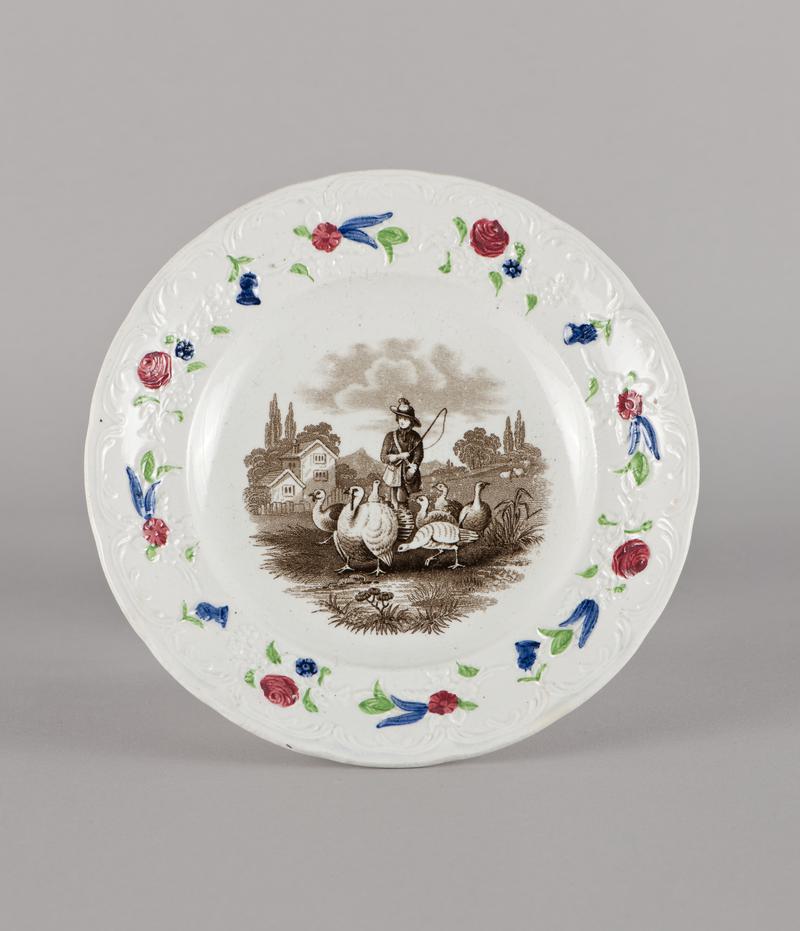 Cockle plate, circular shape with rounded foot-rim, cushion-moulded sides and spreading rim, the rim moulded with a continuous decoration of embossed flower heads and leaves; transfer-printed in black with to the centre of the well a rustic scene showing a female figure standing beneath a porch and banging on a saucepan to awaken bees from hives to one side of the porch, a hen and chickens in the foreground and trees in the background, to the top of the scene is printed "INDUSTRY" and below is printed "A DEAD BEE MAKETH NO HONEY", the plate cracked and repaired.