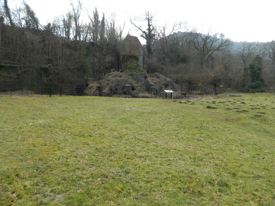 Clydach ironworks showing remains of no.1 furnace on right with arch of charging house above in background, viewed from south west.
