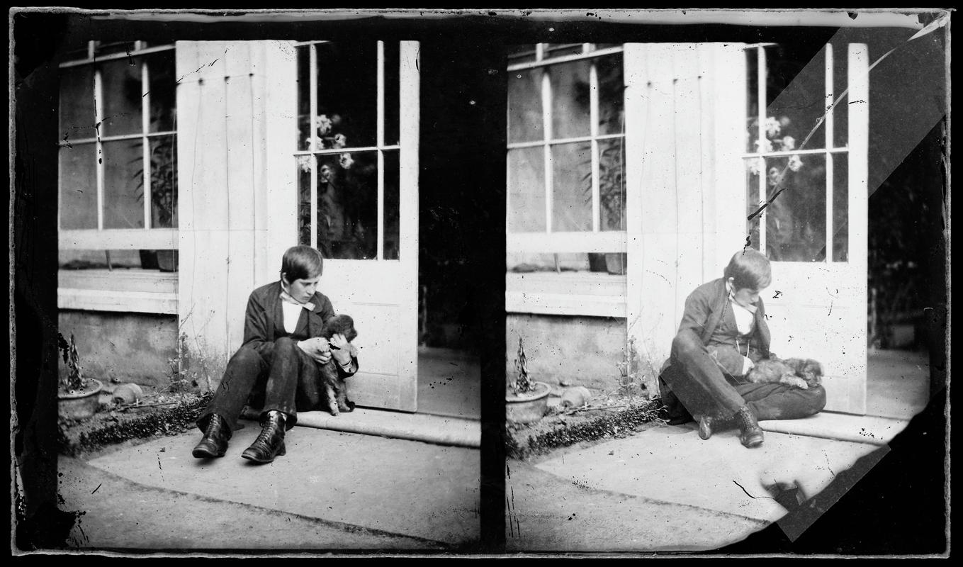 Unwaxed calotype negative of Willy Llewelyn sat in a chair, and holding a top hat, at the side of the porch at Penllergare.