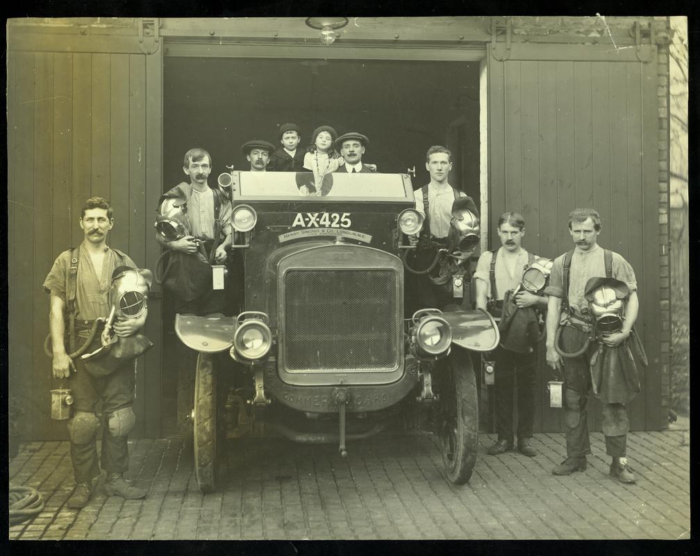 Photographic copy of original photograph. View shows rescue vehicle and brigade. David Williams is at right. Original photograph now accessed as 2005.116/1.