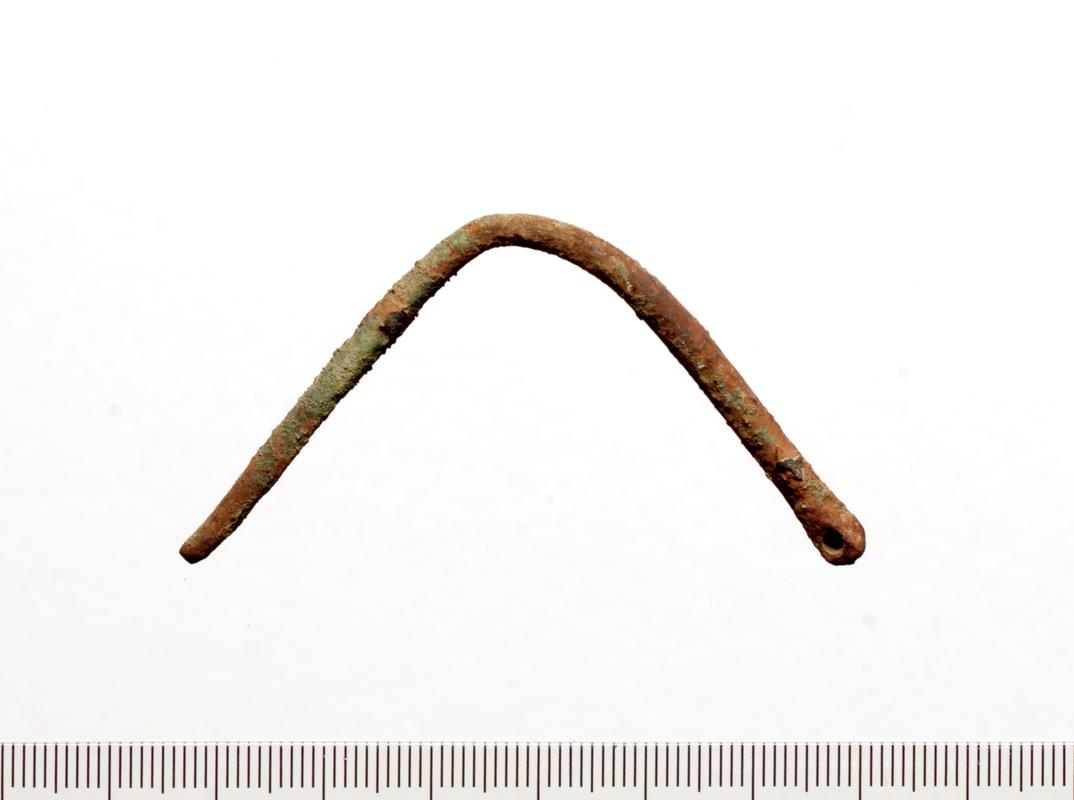 Penannular ring from ringed pin. Sub-circular in cross-section with possible casting line along internal and external edges. Much of the upper surface has been lost.
