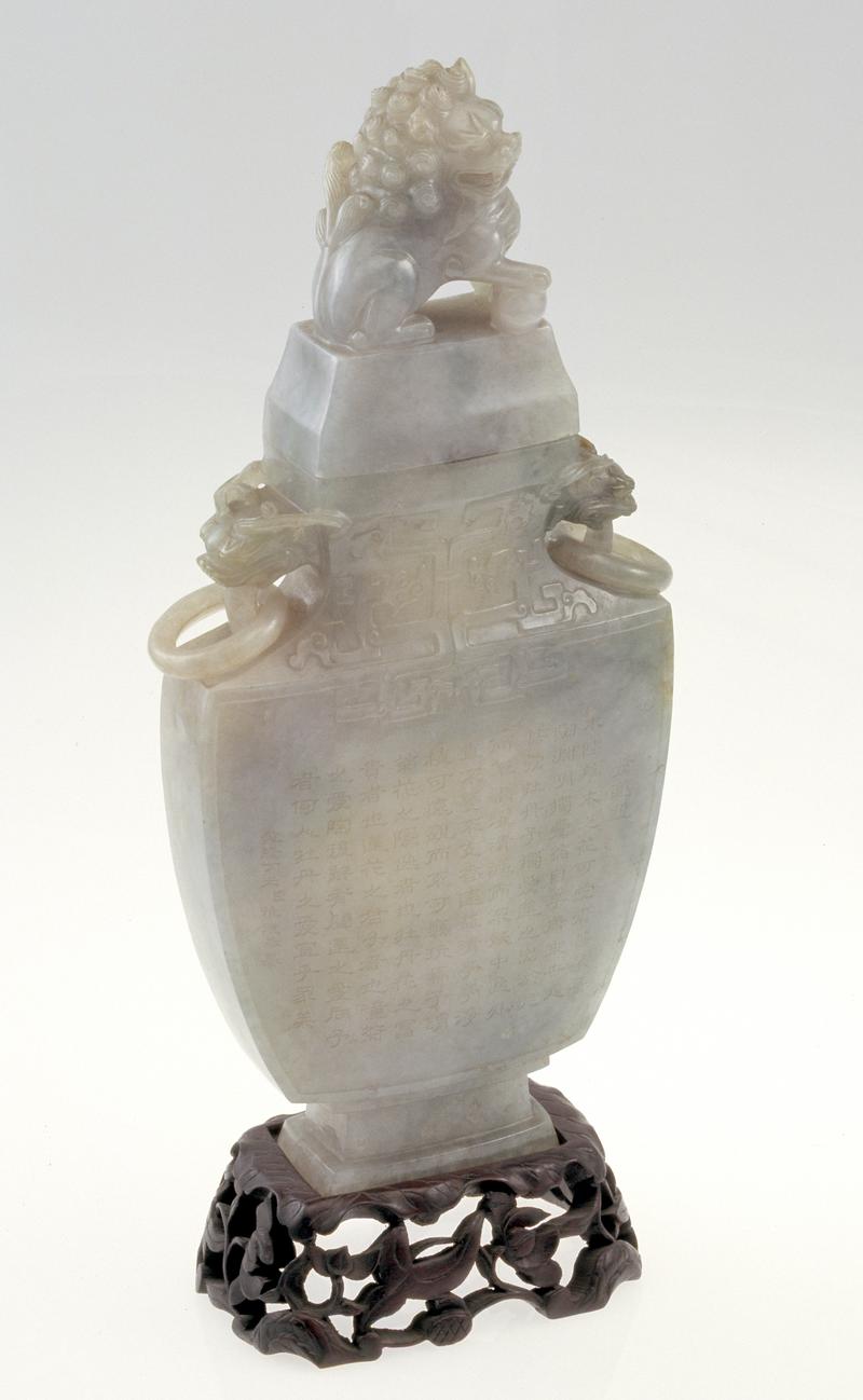 Vase, octagonal, white jade, standing on 8 small feet, with wooden stand.