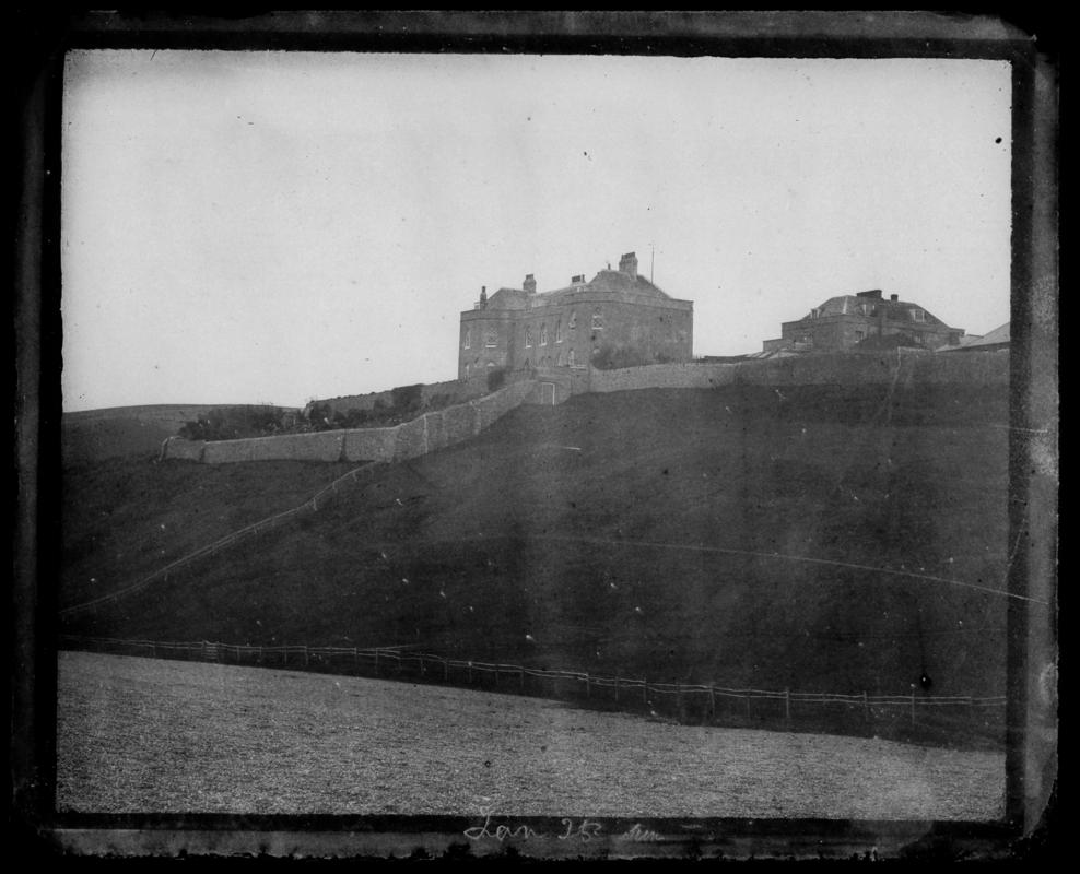 Unwaxed Calotype negative showing large unidentified house with large portico. Tabs on three corners.