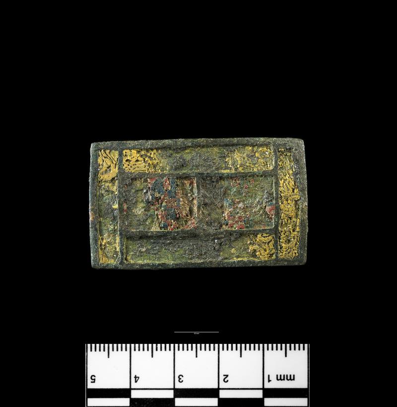 Fragment of a circular? plate with openwork ornament, with hinge loops projecting from a moulded bar to one side of the plate. Perhaps a fitting like the dagger frog from Hod Hill.