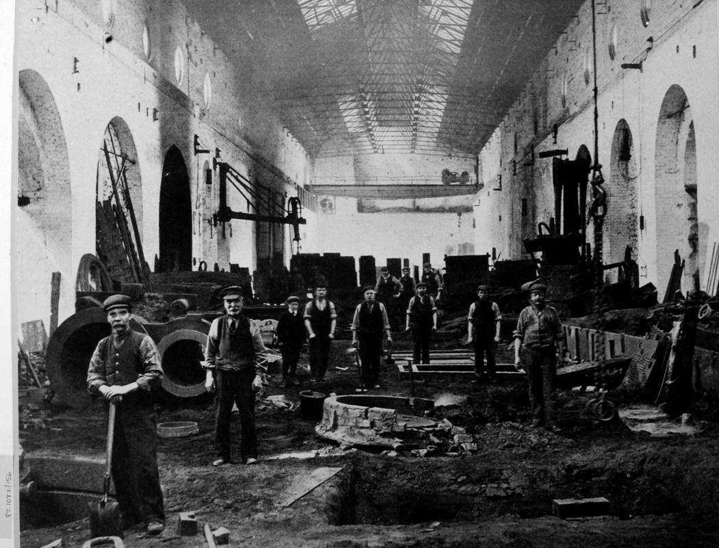 Group of seven men with dogs standing infront of Deep Pit, Nantyglo, mine workings.