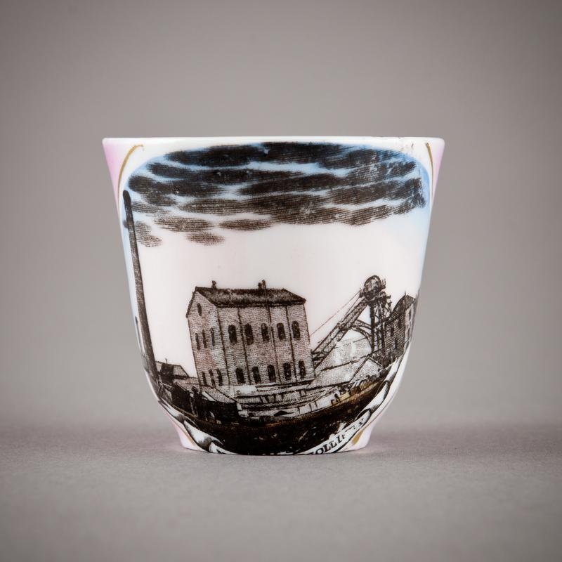 White porcelain commemorative tumbler, painted pink with a gilt rim. On front is a view of 'Navigation Colliery, Treharris', showing chimney, engine house and head gear. Manufacturers mark on bottom.