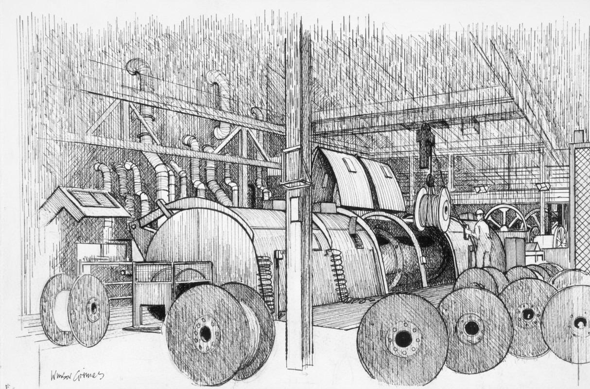 Pen and ink of an interior view at Allied Steel and Wire Tremorfa works, 1987, probably the 16 inch mill. Signed bottom left, but undated.