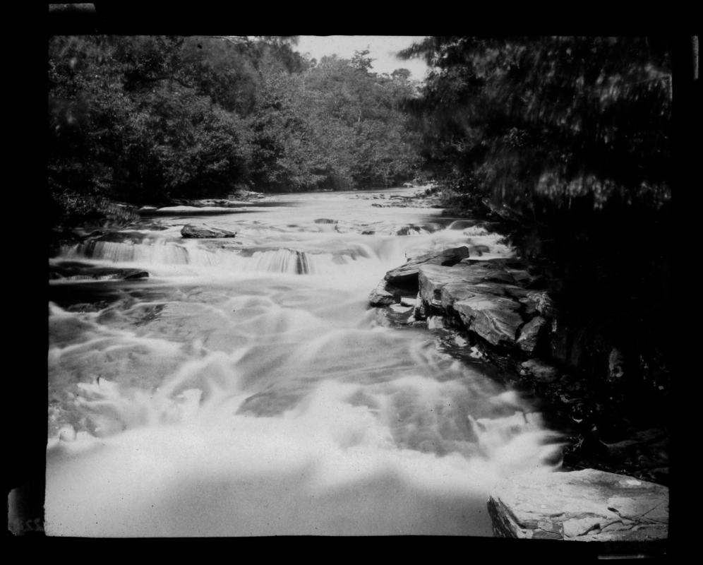 Calotype negative showing tree and rock overhanging river in the Dulais Valley. Tab at each corner.