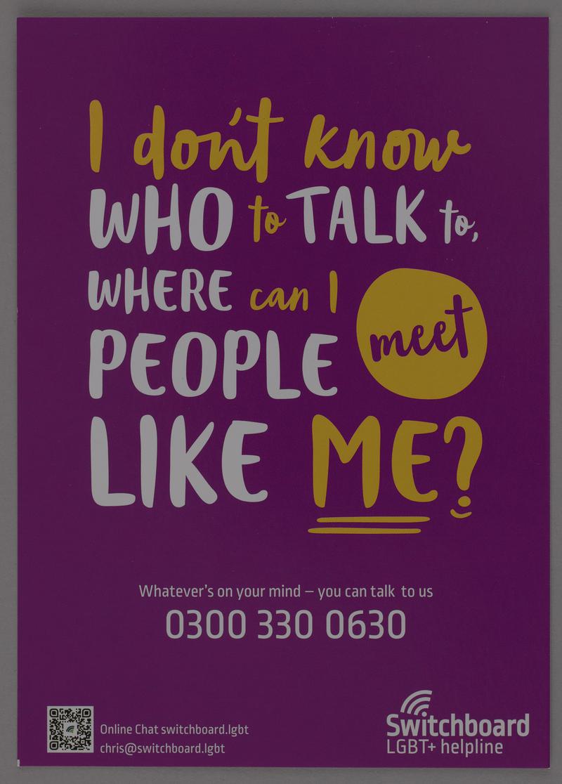 Switchboard LGBT+ helpline leaflet 'I don't know who to talk to where I can meet people like me?'. Given out at Pride Cymru, Cardiff, Saturday 26 August 2022. Collected to show the range of free promotional and advocacy material available at Pride events.