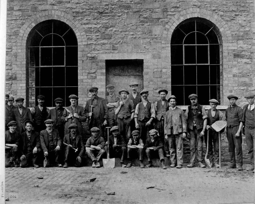 General Mckinnon going down the Bertie Pit, Lewis Merthyr Collieries Hafod, May 4 1912. Showing Col. Bambridge. Capt. Trillon. Gen. McKinnon. Col. Pearson. Mr JW Hutchinson.
