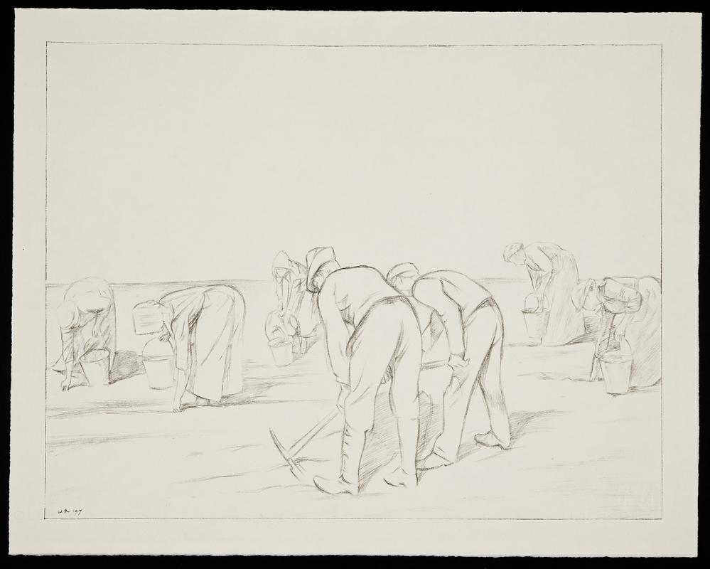 On 15th May 1917, Rothenstein wrote to Ernest Jackson, "I hope to have the 5th drawing finished early this weekand the last next week. I will then come up to town and do what isneedful to the stones". He was not happy with some of his early work, writing, 'somehow the lines seem poor and thin". He decided to print some in a red/brown colour rather than black. These works are simple and understated, a contrast to the busyness and modernity of war shown in many of the other prints in the series. They take their cue from images of rural labour that characterised much landscape painting from the mid-nineteenth century onwards. They were probably drawn around Stroud, Gloucestershire, where Rothenstein was living.