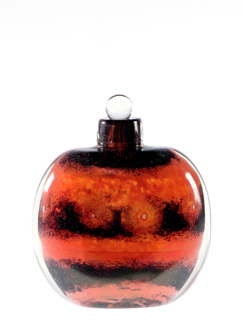 Bottle and stopper, glass; standing on a flat oval base, tear-drop shaped body, narrow neck with a wider, straight sided lip; clear spherical stopper; bottle layered with thin clear glass encasing a layer of bubbles, denser and larger towards the base, surging up to the neck, over a layer of opaque pale pink, grey, and black pigments.