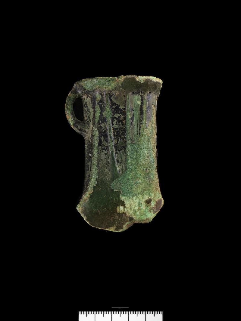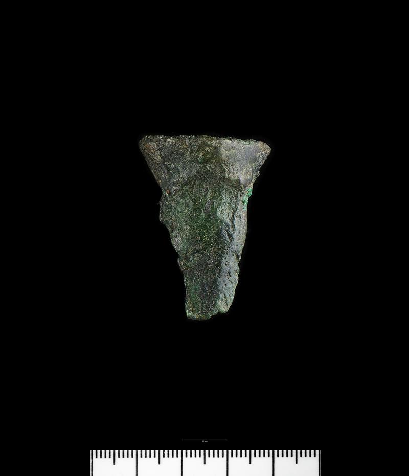 Ingot fragment with convex upper and lower surfaces.Tapering edge section present on one side. Internal and surface vesicles.