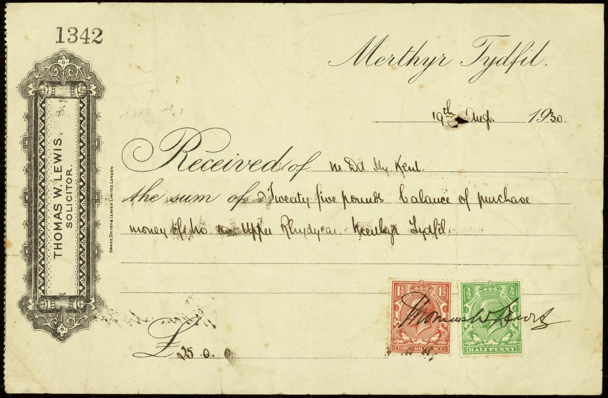 Brown envelope used by Merthyr Tydfil Borough Council to send documents relating to a Compulsory Purchase Order. (Item nos. F2022.116.1-5.) Sent to Mrs Bronwen Davies, 27 Upper Rhyd-y-Car, Merthyr Tydfil. With orange Recorded Delivery sticker on front. Postmark Merthyr Tydfil 7.VII.80.