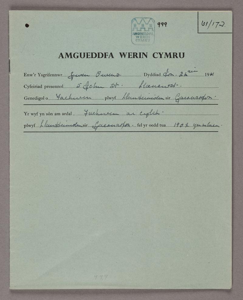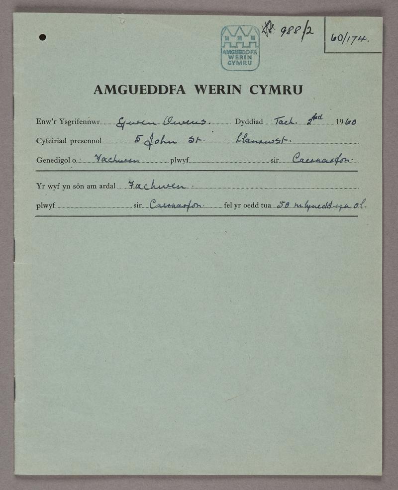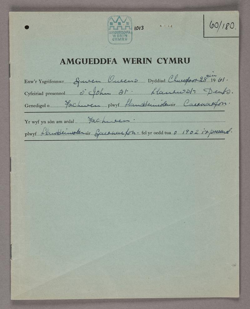 A Welsh Folk Museum Answer Book, 1960, received from Mrs G Owens, Llanrwst, containing notes on the Christmas season in the area of Fachwen, Llanddeiniolen, Caernarvonshire, c. 1912. Answer Books were sent out by the Welsh Folk Museum in 1958 to individuals across Wales as a way of collecting and documenting information on aspects of folk culture in their areas, including agriculture, crafts, food, customs and dialects. The responses were hand-written in the books. The Answer Books had a similar purpose to the earlier questionnaires sent out in 1937.