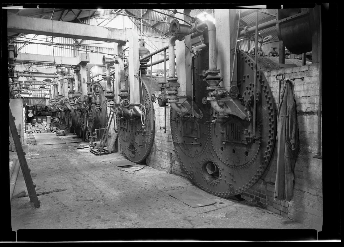 Black and white film negative showing the Lancashire boilers for the two steam winders at Cefn Coed Colliery.