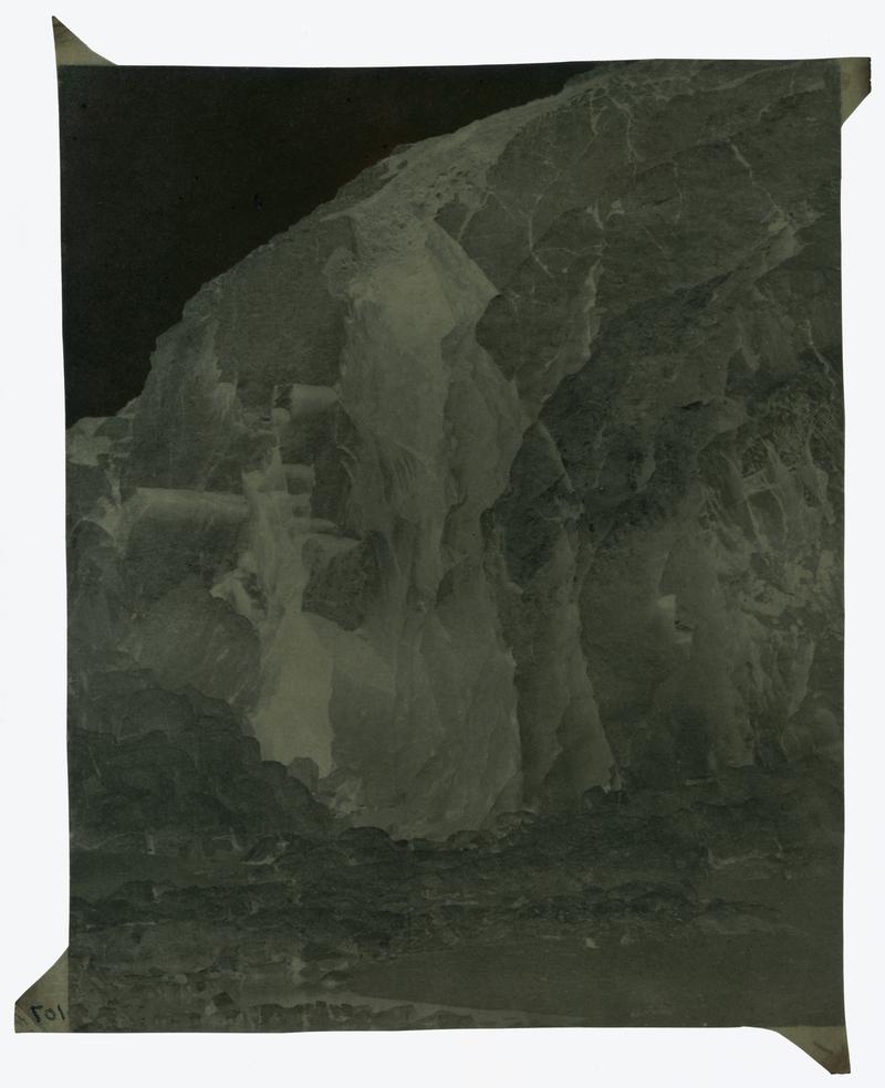Calotype (negative). View of rocks with large slab of granite in centre. Identified as 'Granite on the Mount, Cornwall'. With inscription on reverse. Tabs on all four corners.