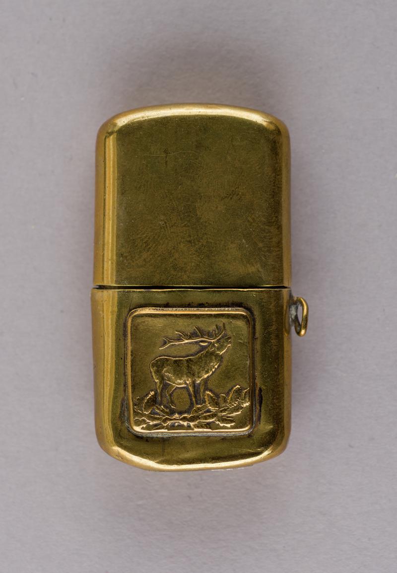 Brass lamp check with inscription on obverse side only and hole at top. Square with rounded corners.