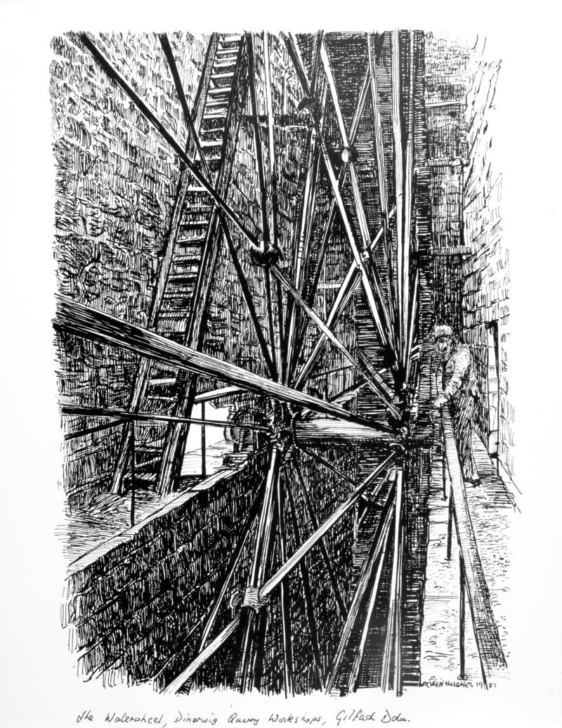 One of a set of drawings commemorating the retirement of Hugh Jones B.E.M. from The Welsh Slate Museum. Mr Jones was awarded B.E.M. in the New Years Honours in 1982.