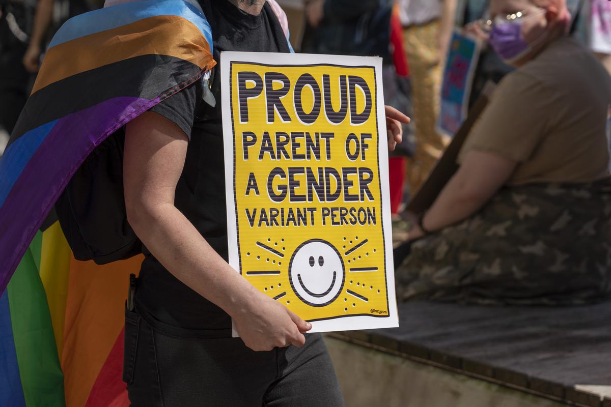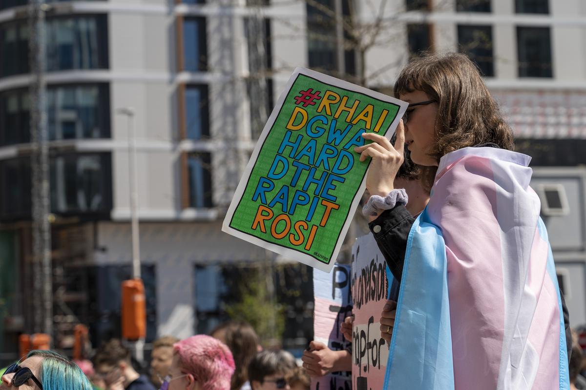 Digital photograph taken at the protest, organised by Trans Aid Cymru, against conversion therapy, on 26 April 2022. About 150 people protested outside the government offices on Wood Street in central Cardiff to oppose conversion therapy for transgender people in the UK.