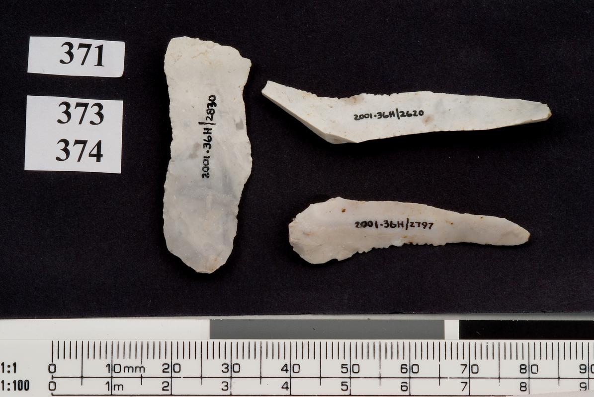 A complete perforated stone bead. The blank is an irregular rhomboid in shape and the perforation is off-centre. The bead has been perforated by drilling from one side.