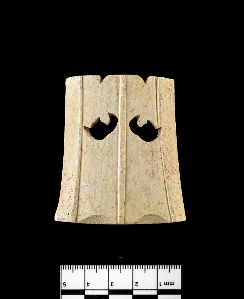 Bone scabbard box chape. The central part of a front plate decorated by a raised central rib dividing a raised ellipse with a pair of incised scrolls near the top. There is a small circular hole in the top left corner, this probably took a rivet to help secure it to the scabbard.