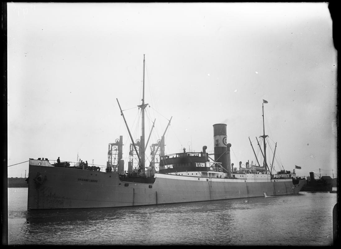Sepia photograph showing port beam view of the S.S. TAPTI (James Nourse & Co.) seen at Galveston with the tug CHAS CLARKE alongside. August 1927. Mounted on grey card.