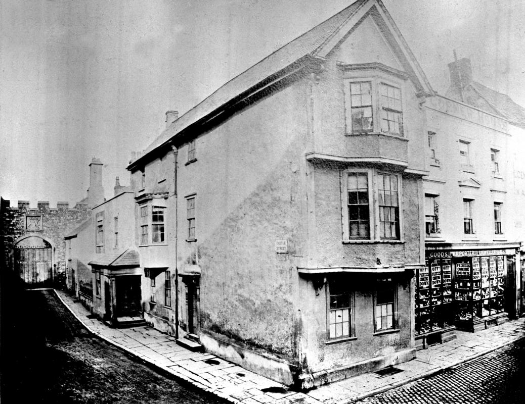 Copy of a photograph showing 'High Corner House' (a 17th Century house demolished in 1877) and the offices of Lord Bute's solicitors, Cardiff, c.1876. The castle gates can be seen at the end of Castle street.