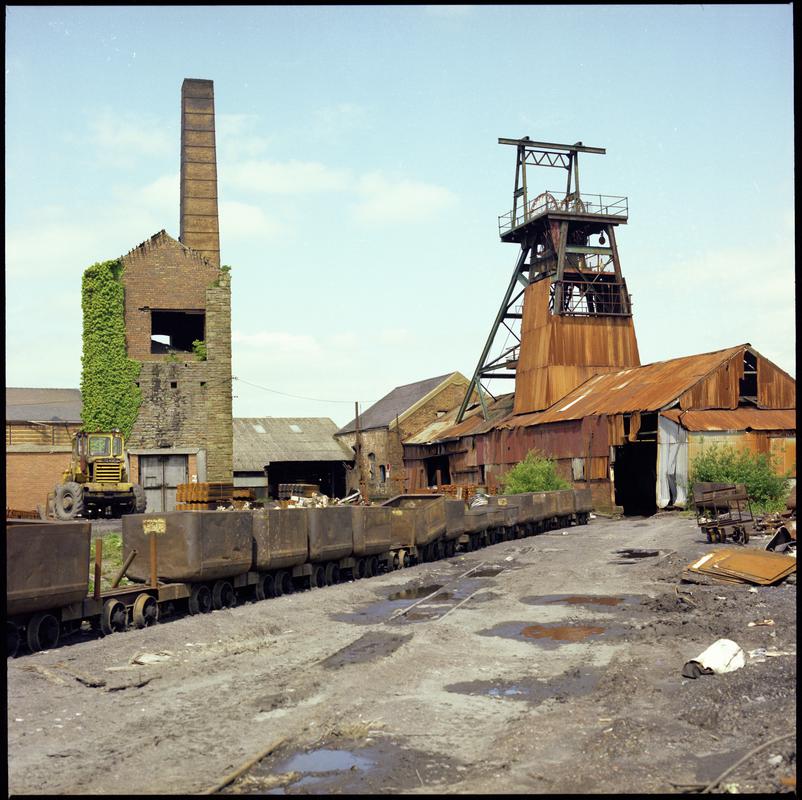 Black and white film negative showing the interior of the engine house, Penallta Colliery, photographed from a publication. 'Penallta Colliery' is transcribed from original negative bag.