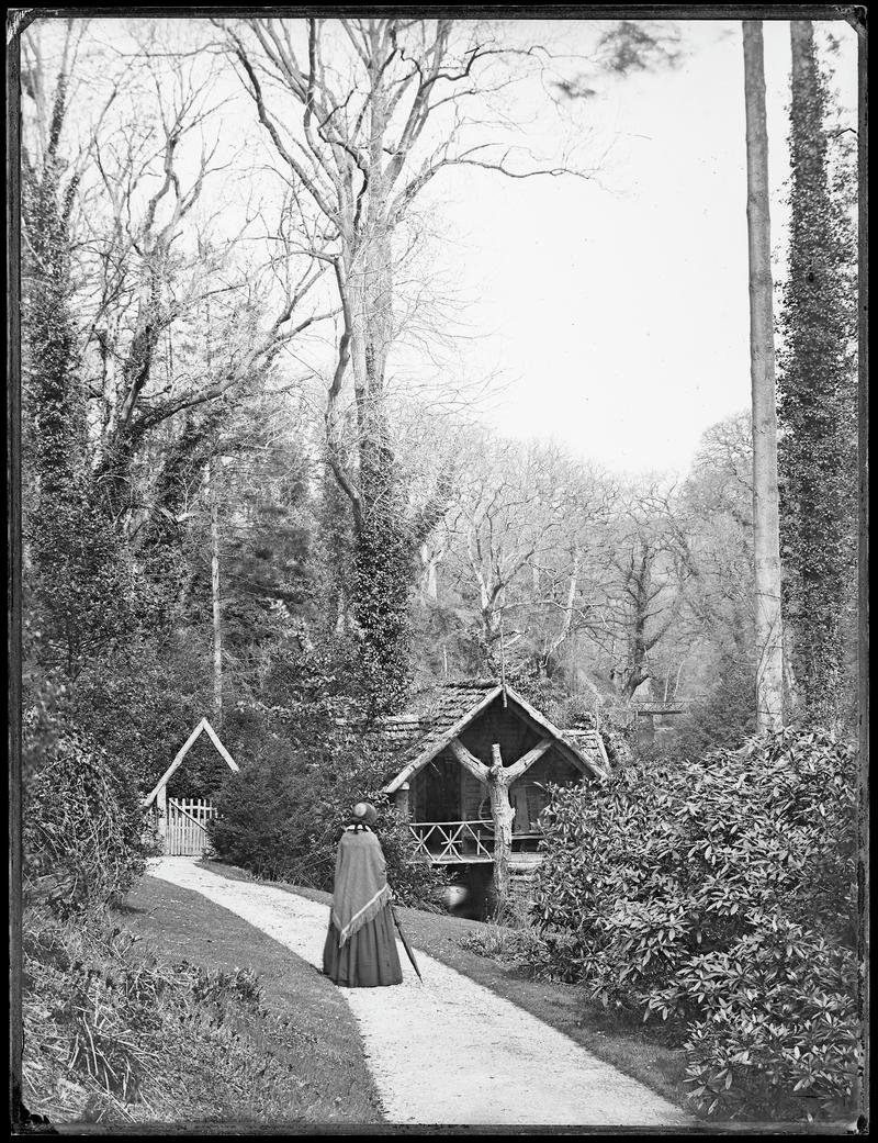 Mounted salted paper print showing canoe tied up on bank next to the shanty on the Upper Lake at Penllergare. All corners clipped on photograph. Mounted on card, and photograph outlined in black ink on mount.
