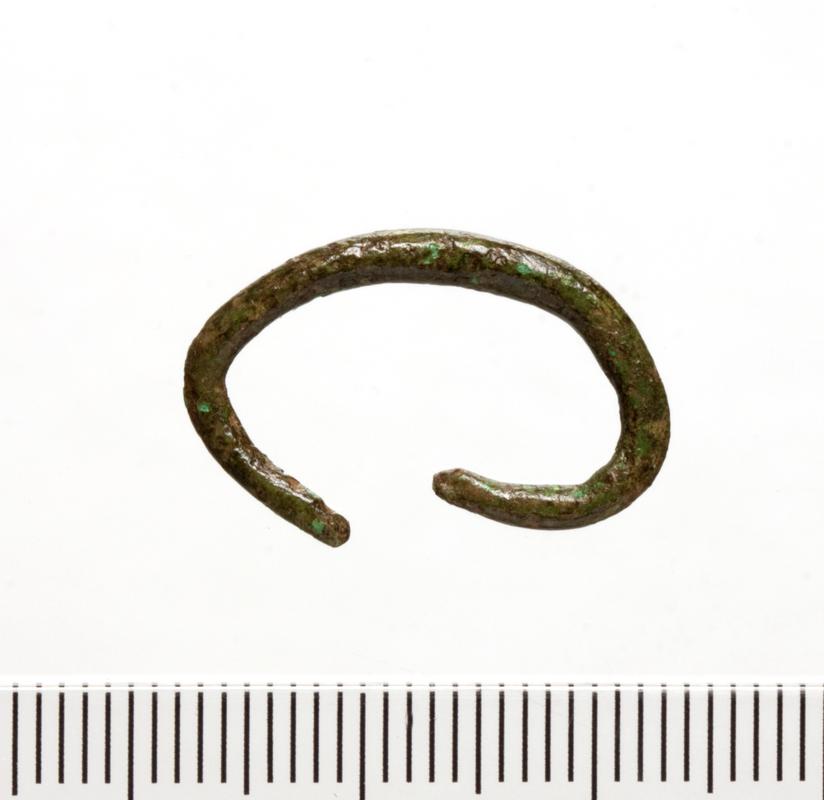 Bronze pin with multi-faceted head; the shank, which has been bent, is circular in section.