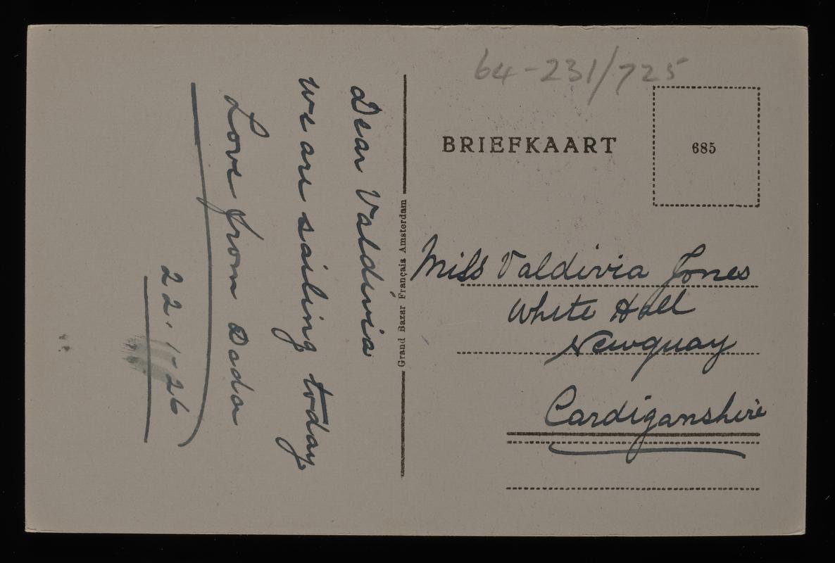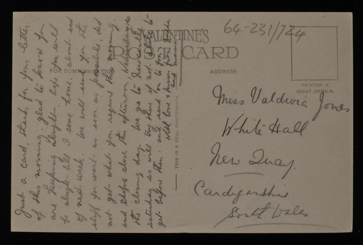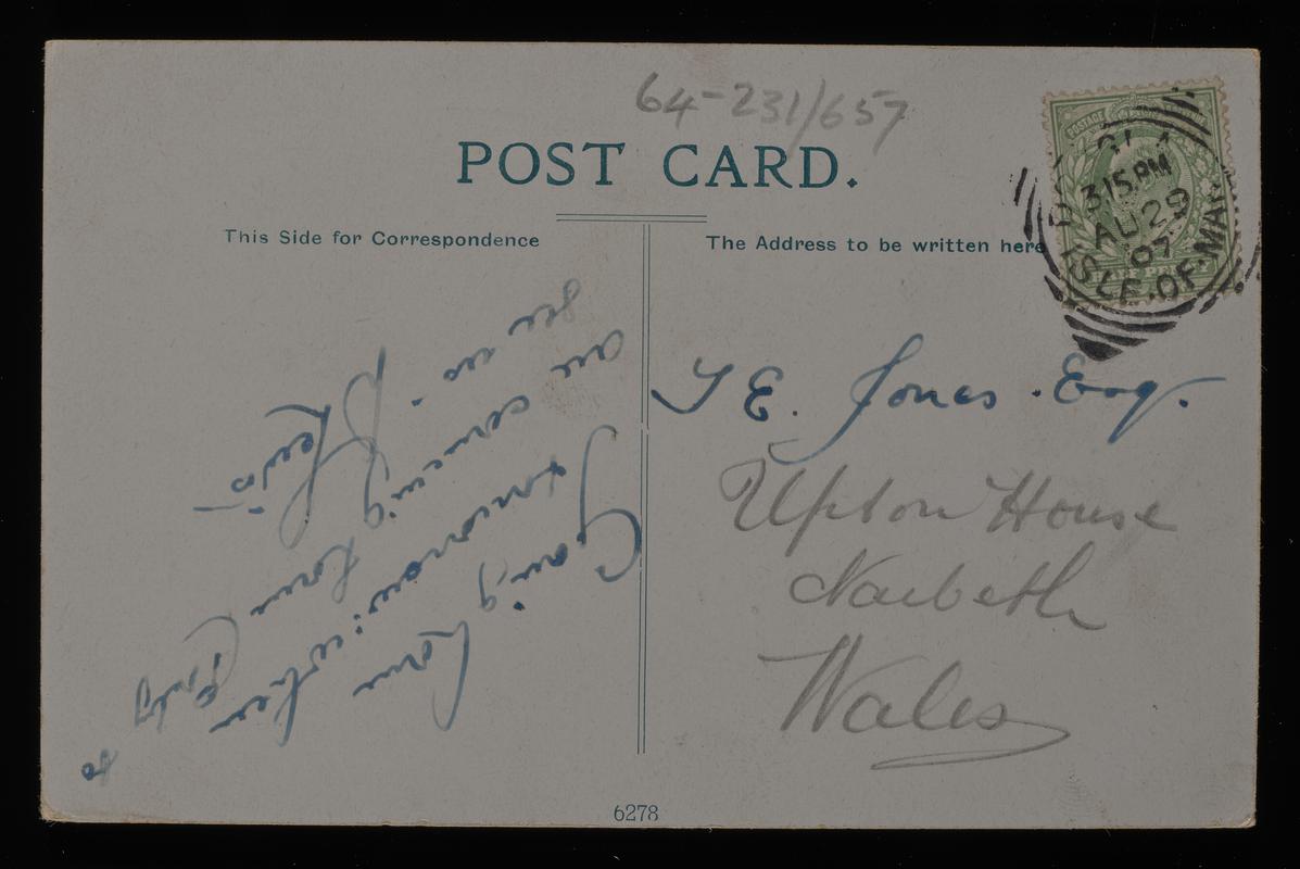 Black and white postcard "Air View Of Bargoed". Sent to Mrs C.R. Vodden of Aylesbury. Postmarked 07 October 1930.